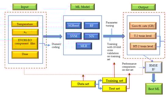 The input variables were temperature, aw, film type, and dose of EO component in the EVOH films. The output variables were GR, T-2 concentration, and HT-2 concentration. The output values were averaged as only one output value is associated with a set of input values. Variables were preprocessed before mathematical treatment. For mycotoxin outputs, the decimal logarithm of average mycotoxin concentration plus 1 was computed. The categorical input variable (type of EVOH film) was transformed in numerical variables by recoding them as dummy variables []. An easy explanation of this coding procedure can be read in []. Before training the ML models, every data set was randomly split into training (approximately 75%) and test (approximately 25%) set. The training set was used to build/cross-validate the ML models and the test set was used to assess its performance on independent data. MLR uses all independent variables to predict the output value and the coefficients are chosen by the least squares method. It is assumed that there is a linear relationship between the dependent variable and independent variables.