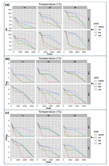 Graphs of the datasets for GR (a), T-2 level (b), and HT-2 level (c). The input variables are: temperature (top) with three levels (15, 20 and 28 °C), aw (right) with two levels (0.96 and 0.99), essential oil component (EOC) of the EVOH films (color lines connecting data points) with four levels (CINHO, CIT, IEG and LIN), and dose of the essential oil component (bottom) with five levels (0, 333, 666, 1665 and 3330 µg/culture). The output variables are on the left side of the Figure: GR is measured in mm/day; for both T-2 and HT-2 toxins the output values are the decimal logarithms of their concentrations plus 1. Only mean values are considered for inputs and outputs.