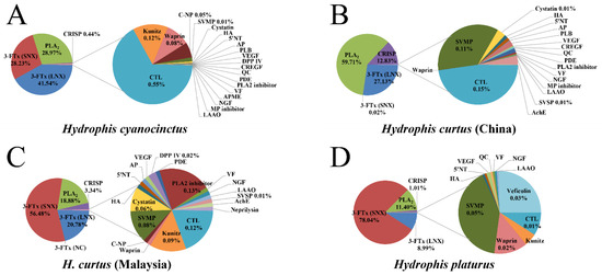 Comparison of the overall venom-gland transcriptomic profiles of three sea snakes: (A) current study; (B–D) cited and rearranged from Zhao et al. [24], Tan et al. [29] and Durban et al. [27], respectively. NC, non-conventional neurotoxin; SVSP, snake venom serine proteinase; AchE, acetylcholinesterase. Relative abundances less than 0.01% are not indicated in the toxin families.
