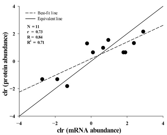 To evaluate the correlation between translational and transcriptional abundances of toxins, the MS data of protein bands were further assigned to 11 genes from an in-house database constructed from toxin-coding transcripts (Table 1). Considering that each of the five protein bands, including three 3-FTxs, one PLA2 and one CRISP, could be matched with 2–3 toxin-coding transcripts due to having the same scores, the abundance of each toxin at the protein level was divided equally among these transcripts, although this may have arbitrarily reflected the protein abundance translated by these transcripts. The results indicated that the abundance of these 11 toxins at the protein level was strongly correlated with that at the mRNA level (ρ = 0.73, p = 0.01) according to Spearman’s rank correlation analysis, and this was validated by the linear regression analysis with a relatively high Pearson’s correlation coefficient (R = 0.84, p = 0.001). Furthermore, the transcript abundances could explain the majority of variation in protein abundance (R2 = 0.71, p = 0.001) (Figure 4).