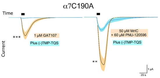 Left panel: The α7C190A current induced by 1μM GAT107 in the absence (black line, n = 7) and presence (blue line, n = 7) of (-)100 μM TMP-TQS over time. Right panel: The current induced by 60 μM PNU + 50 μM MrIC in the absence (black line, n = 6) and presence (blue line, n = 6) of 100 μM (-)TMP-TQS over time. n.s. stands for not significant, ** stands for p < 0.01, and *** stands for p < 0.001. The black box indicates the time of MrIC application. The orange and cyan bands indicate the error margins of the measurements. See the Materials and Methods section for a more detailed explanation on the measurements and how the error bands are calculated.