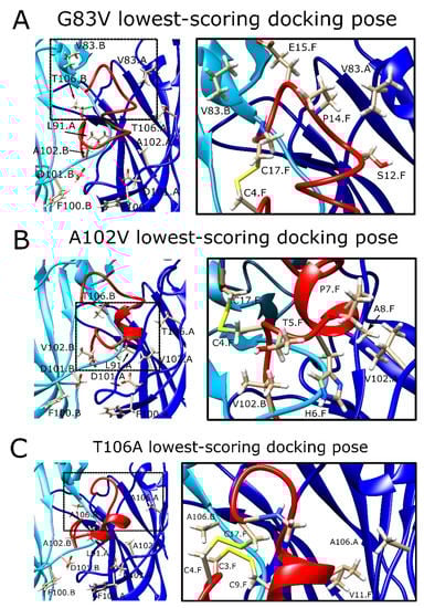 2.8. The α7G83V Mutation Caused an Increase in the Binding Strength of Several Peptide Residues in Peptide Docking Calculations