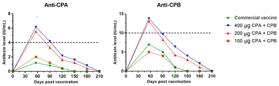 After day 210, antibodies were not detected in any of the studied groups, which may have been a limitation of the immunodiagnostic technique; the test level used in serum neutralization detects no antibody titers below 4 IU/mL for anti-CPA, and 10 IU/mL for anti-CPB [15,23]. However, this could have also been related to vaccination protocols or even to the type of adjuvant used, which requires the development of new vaccine strategies that propose semiannual vaccination protocols, as well as the use and development of new adjuvant and immunostimulant molecules to maintain circulating neutralizing antibody levels for periods of up to one year. New studies should also be conducted to evaluate and modulate humoral immune responses via neutralizing antibody titration, and to stimulate the generation and quantification of memory cells. This is another important vaccination objective, because memory cells can survive for years and respond more quickly and effectively against antigens [24].
