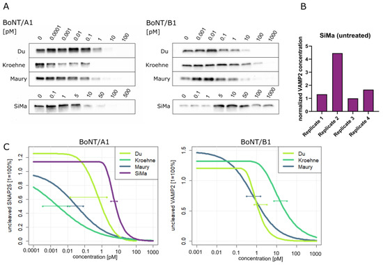 The application of BoNTs requires prior potency determination, for which only partial replacement of the mouse lethality test has been achieved [2]. In this study, we compare the sensitivity of MNs differentiated according to three different protocols to the sensitivity of the tumor cell line SiMa, which is used in several (proprietary) alternative methods [34]. To this end, SiMa cells were partially differentiated into a more neuronal phenotype and MN populations were generated as described in detail in Schenke et al. [28]. Human iPSCs (IMR90-04) were used for direct differentiation to MNs with protocols based on Du et al. [35] and Maury et al. [36], while the differentiation based on the publication by Kroehne et al. [37] is separated into differentiation of iPSCs to neuronal progenitor cells (NPCs), which can be expanded and differentiated further into MNs. The differentiated cells were treated with several concentrations of BoNT/A1 and B1 for 48 h and then analyzed for the cleavage of the respective BoNT substrate. The fraction of remaining full-length SNAP25 or VAMP2 after BoNT/A1 or B1 treatment, respectively, was analyzed via Western Blot, normalized to the total protein content per lane, and concentration–response data were modelled by nonlinear regression (Figure 1).