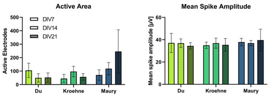 Activity of MN populations differentiated according to the protocols by Du et al. [35], Kroehne et al. [37] and Maury et al. [36] on high-density microelectrode arrays (HD-MEAs) after 7, 14 and 21 days on the chips (days in vitro, DIV). Cells from one differentiation each were seeded on six HD-MEAs, respectively. Recorded parameter are the active area and the mean spike amplitude. Data represented as mean ± standard deviation, n = 6.