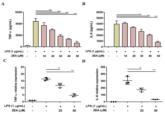 The effect of ZEA on the secretion of proinflammatory cytokines by LPS-activated macrophages. J774A.1 cells were pre-treated with ZEA for 1 h, and then treated with 1 μg/mL LPS for 6 (for qPCR) and 24 h (for ELISA). (A,B) The secretion of TNF-α and IL-6 was determined using ELISA. Data from three separate experiments are presented as mean ± SD. (C,D) The gene expression of TNF-α and IL-6 was measured by qPCR (n = 5). Statistical significances are presented as * p < 0.05; ** p < 0.01; *** p < 0.001.