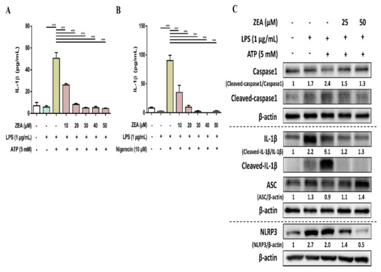 The effect of ZEA on the activation of NLRP3 inflammasome by LPS-activated macrophages. J774A.1 cells were pretreated with ZEA for 1 h, and then treated with 1 μg/mL LPS for 5 h following 5 mM ATP or 10 μΜ nigericin treatments for 30 min. (A,B) The secretion of IL-1β was analyzed by ELISA. Data from three separate experiments are presented as mean ± SD. NLRP3 inflammasome-associated protein expressions were determined by Western blot. A representative image of three independent experiments is shown in (C). Statistical significances are presented as *** p < 0.001.
