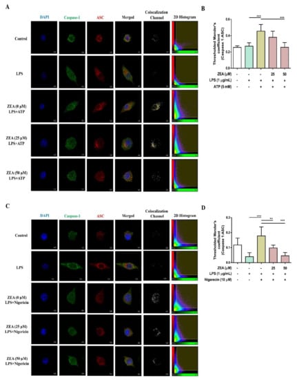 The effect of ZEA on the formation of NLRP3 inflammasome by LPS-activated macrophages. J774A.1 cells were pretreated with ZEA for 1 h, and then treated with 1 μg/mL LPS for 5 h following ATP (5 mM) or nigericin (10 μΜ) treatments for 30 min. (A,C) Representative images of colocalization of caspase-1 (green) with ASC (red) were shown. DAPI was used as a nuclear counterstain. (B,D) The formation of ASC speck was quantified using the colocalization of caspase-1 and ASC signals in the threshold of 2D histogram (in the panel A and C) by Mander’s coefficient. Data from three separate experiments are presented as mean ± SD. Statistical significances are presented as ** p < 0.01; *** p < 0.001.