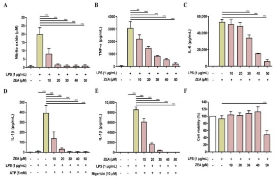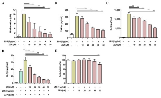 The effect of ZEA on the production of NO and proinflammatory cytokines by LPS-activated BMDMs. The cells were pretreated with ZEA for 1 h, and then treated with 1 μg/mL LPS for 24 h. (A) The levels of NO production were analyzed using Griess reaction. Secretions of (B) TNF-α and (C) IL-6 were detected by ELISA. (D) BMDMs were pretreated with ZEA Figure 1. h, and then treated with 1 μg/mL LPS for 5 h following 5 mM ATP for 30 min. The secretion of IL-1β was examined by ELISA. (E) Cell viability was detected using MTT assay. Data from three separate experiments are presented as mean ± SD. Statistical significances are presented as * p < 0.05; *** p < 0.001.