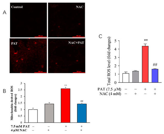 To clarify the role of NAC in oxidative stress induced by PAT, the changes in intercellular ROS levels were measured by DCFH-DA probe. As exhibited in Figure 3A,B, the mitochondria-derived ROS was assessed by a MitoSOX Red Mitochondrial Superoxide Indicator. Results indicated that, compared to the control group, PAT significantly increased the intensity of red fluorescence. Furthermore, PAT treatment resulted in a remarkable increase in intracellular ROS compared with the control treatment. Nevertheless, the ROS level was dramatically decreased in the presence of NAC (Figure 3C). The changes were significantly attenuated by NAC. All these results showed that NAC obviously reduced the generation of total and mitochondria-derived ROS in response to PAT exposure.
