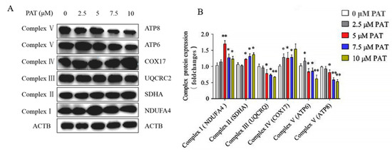 PAT caused the impairment of the mitochondrial respiratory chain complex signaling pathway. Different concentrations of PAT were used to treat HEK293 cells for 10 h. (A) Western blot detection of respiratory chain complex protein expression after PAT treatment at different concentrations. β-Actin served as an internal reference. The images are representative of three independent experiments. (B) Mitochondrial respiratory chain complex protein expressions (means ± SD, n = 3). * p < 0.05 and ** p < 0.01 compared with the 0 μM PAT group.