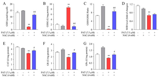 Accumulating evidence has indicated that glutathione metabolism and other antioxidant enzymes are the most critical cellular defense mechanisms for protecting against oxidative stress damage [37]. To explore the positive effect of NAC, the levels of GSH and GSSG were examined. PAT treatment decreased GSH level and increased GSSG level significantly compared with the control group. In contrast, NAC pretreatment exhibited an opposite effect compared to the PAT group (Figure 8A,B). Consistently, the ratio of GSH to GSSG was significantly increased in the PAT plus NAC treatment group (Figure 8C). The activities of CAT, SOD, GPx, and GR were reduced notably after PAT treatment, whereas cotreatment with NAC dramatically increased their activities (Figure 8D–G). Taken together, these findings suggested that NAC can reduce the GSH depletion and restore the decline in antioxidant enzyme activities induced by PAT.