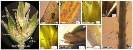First of all, detached spikelets were inoculated with each microorganism separately. After 8 days of incubation, spikelets were dissected and internal tissues were observed to verify the endophyte capacities of the pathogen and BCAs. In Figure 1, optical microscope images show the different constituent parts of wheat spikelet (awn, lemma, palea, anther, ovary) and colonization of microorganisms in situ. F. graminearum (Figure 1G), rapidly colonized the palea/lemma and was able to penetrate into the tissue via stomata and to produce large quantities of conidia. All three BCAs were able to colonize the internal tissues of the spikelet. Myco (Figure 1M) colonized the epidermis of the tissues and produced numerous small pellet colonies, specific to actinomycetes. A characteristic white spore layer was produced on the surface. Xeda (Figure 1X) invaded the tissues with aerial mycelium. It used damaged areas at the edge of palea tissues, or more fragile tissues, such as the ovary inside the spikelet, to produce sporulating colonies. Poly (Figure 1P) was also able to settle and colonize the palea or the base of the lemma awn and quickly produced a large quantity of characteristic oogonia containing oospores. None of the BCAs inoculated alone caused any apparent symptoms on the spikelets (no loss of chlorophyll, necrosis, or desiccation) as compared to those inoculated with F. graminearum alone.