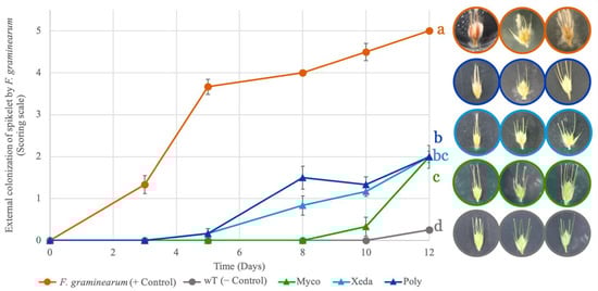 Comparative effects of BCA treatments on the external colonization of spikelets by F. graminearum during antagonist bioassay. Colors of curve and photography outline correspond to different treatment: Myco: Mycostop®, Xeda: Xedavir®, Poly: Polyversum® in confrontation with F. graminearum. The pictures illustrate the level of contamination after 10 days of growth of pathogen and BCAs. Antagonist bioassays were performed on detached spikelet for 12 days at 20 °C with photoperiod. External colonization was expressed using scoring scale (from level 0, assigned level 5 for spikelets strongly infected with mycelium, necrosis and possible presence of sporodochia), described in Experimental Section (modified from [14]). Data table is presented in the Supplementary Information (Table S1) and 15 replicates were considered. Graphic presents means and SE. ANOVA tests were conducted on area under growth curves, p-value < 0.05.