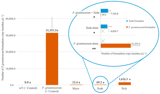 Comparative quantification of F. graminearum and Xeda biomarkers on detached spikelet. Antagonist bioassays were performed on detached spikelet at 20 °C with a photoperiod, and analyzed after 8 days of co-culture. Main graphic presents quantity of F. graminearum biomarkers in number of copy·μL−1 in presence of different BCAs treatments. Myco: Mycostop®, Xeda: Xedavir®, Poly: Polyversum®. A focus was realized on F. graminearum–Xeda interaction in blue circle: quantity of F. graminearum biomarkers copy and Xeda biomarkers. * in number of copy·μL−1 was compared alone or in confrontation on detached spikelet. ** For both graphic, number of biomarkers copy·μL−1 correspond to μL of ddPCR reaction mixture (or 22 μL by sample as described in the Experimental Section). Data table is presented in the Supplementary Information (Table S2). Three replicates were considered, graphic present means and SD. ANOVA test, p-value < 0.01.