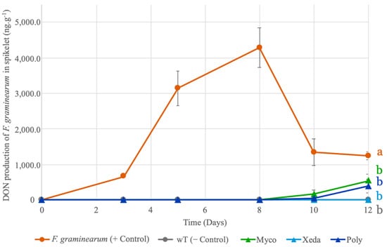 Comparative effects of BCA treatments on DON production of F. graminearum in spikelet during antagonistic bioassay. Colors of curve correspond to different treatment: Myco: Mycostop®, Xeda: Xedavir®, Poly: Polyversum® in confrontation with F. graminearum. Antagonistic bioassays were performed on detached spikelet for 12 days at 20 °C with photoperiod. DON production was expressed in ng·g−1 of spikelet. Data table is presented in the Supplementary Information (Table S1) and 12 replicates were considered. Graphic presents means and SE. ANOVA tests were conducted on area under mycotoxin production curves, p-value < 0.01.