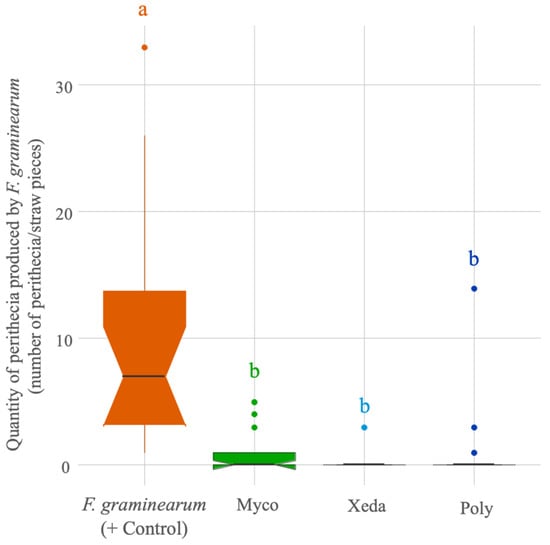 Comparative effect of BCAs on perithecia production by F. graminearum during antagonistic bioassay on wheat straw. Myco: Mycostop®, Xeda: Xedavir®, Poly: Polyversum® in confrontation with F. graminearum. Antagonistic bioassays were performed on wheat straw for 3 weeks at 20 °C in dark. Boxplot represents the distribution of the 18 replicates per conditions, ANOVA test, p-value < 0.05. Data table is presented in the Supplementary Information (Table S3).