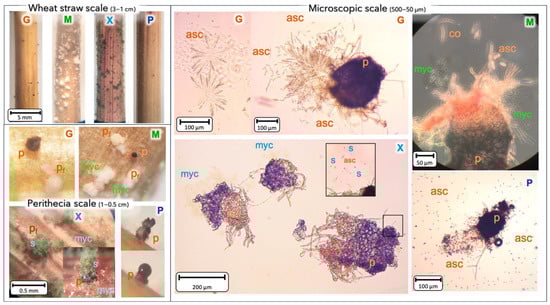Macroscopic and microscopic BCAs impact on perithecia produced by F. graminearum. Pictures show the interaction between F. graminearum perithecia and the three BCAs at different levels in situ or on microscope slides. Bold letters: G, F. graminearum (orange); M: Mycostop® (green); X: Xedavir® (turquoise blue); P: Polyversum® (dark blue). Lower case letters indicate the different parts of microorganisms: myc: mycelium, sp: sporulation, asc: F. graminearum ascospores, co: F. graminearum conidia, pf: perithecia in formation, p: perithecia. Optical microscope images were taken after 3 weeks of incubation on wheat straw at 20 °C.
