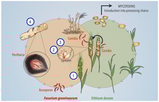 To develop this approach, one of the most devastating diseases of wheat, Fusarium head blight (FHB), caused mainly by F. graminearum, a mycotoxigenic fungus, was used as a model. F. graminearum is the dominant species of the FHB complex in many European countries [8], leading to yield and quality losses of cereal production, but also to contamination by some trichothecenes [3,9,10]. At the beginning of field epidemy and when environmental conditions are favorable, F. graminearum infects wheat plants at the flowering of the ears, during the formation of anthers. After spore germination, the mycelium colonizes the tissues via wounds or natural openings. After this first phase, which is described as biotrophic, the fungus triggers tissue necrosis by accumulation of mycotoxins and intracellular growth, allowing it to progress rapidly to invade other close spikelets. The production of mycotoxins is essential for the successful colonization of wheat ears by F. graminearum, and its synthesis is stimulated by the plant’s defense compounds [11]. The life cycle of the pathogen then continues after the wheat harvest in the crop debris with saprophytic activity until the formation of the conservation structure, the perithecia. The pathogen can survive in this form under unfavorable conditions for a long period of time, leading to infected crop residues being the main potential source of inoculum [12].