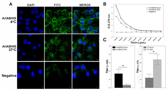 Characterization of ArtABHIS purified from E. coli. (A) binding (at 4 °C) and uptake (at 37 °C) of 50 μg/mL ArtABHIS after 1 h on Vero cells using anti-6XHIS (α-HIS) and FITC-conjugated secondary antibodies (negative = no toxin control, scale bar = 10 μm), (B) representative ELISA dilution series of ArtABHIS on ganglioside GM1 and fetuin (negative = no toxin control), and (C) average titers of fetuin and GM1 ELISAs of ArtABHIS using α-HIS and CT using anti-CT (α-CT) antibody. Results show the mean +/− SE (n = 4). A two-tailed, unpaired t-test was performed for comparison within each toxin group (ArtABHIS fetuin to GM1 * p = 0.0487; CT fetuin to GM1 * p = 0.0262).