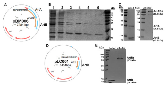 Purification of ArtAB and ArtB from E. coli. (A) plasmid pBM006 for expression of ArtAB, (B) SDS-PAGE of ArtAB purified with fetuin, showing increasing salt fractions (1: flow through, 2: 0.1 M NaCl, 3: 0.1 M MgCl2, 4: 0.5M NaCl, 5: 0.5M MgCl2, 6: 1 M NaCl). (C) SDS-PAGE of the ArtAB elution purified with d-galactose, and boiled/unboiled samples, (D) plasmid pLC001 for expression of ArtB and (E) SDS-PAGE of the ArtB elution purified on d-galactose, boiled and unboiled samples.