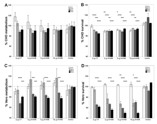 Metabolic and cytotoxic activity of ArtAB and CT on epithelial cells in vitro. (A) Resazurin metabolic assays and (B) crystal violet cytotoxicity assays on CHO cells, and (C) resazurin and (D) crystal violet assays on Vero cells. Purified ArtAB was incubated with cells at 2, 5, or 10 μg per 200 μL well for 4, 24, 48, or 72 h at 37 °C. Results are reported as the percent of vehicle control activity, and toxin groups at each time point are compared to media alone (also reported as the percent of vehicle control activity) using a one-way analysis of variance (ANOVA) and Tukey’s HSD. Stars above the bar indicate a significant difference from media alone at that time point (* p ≤ 0.05, ** p ≤ 0.01, *** p ≤ 0.001, **** p ≤ 0.0001).