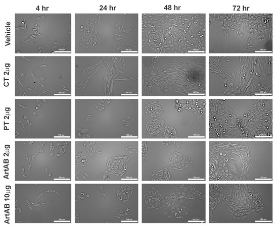 Cellular morphological changes in response to treatment with ArtAB were examined using light microscopy. Treatment with ArtAB caused CHO cells to exhibit some elongation and a definitive clustering morphological phenotype compared to vehicle-treated cells beginning at 24 h. This response was similar to that induced by 2 μg of PT (Figure 5). By 72 h, CHO cell clusters were larger and less distinct for both toxins. In contrast, CT induced a distinctive elongated phenotype on CHO cells that was observable through 72 h. Cell length was quantified from representative images and, while significant CHO cell clustering effects by ArtAB were not identified using this method, CT elongation was highly consistent and easily quantified (Supplementary Figure S4A).