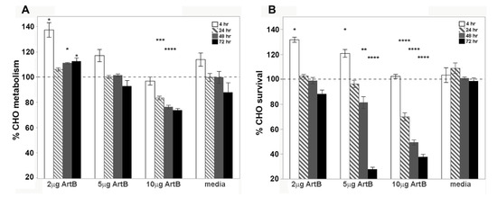 Cellular activity was assessed using alamarBlue™ and crystal violet assays. 96-well plates were seeded with Vero or CHO-K1 cells at a density of 5000 cells per well in 200 μL of complete culture media and incubated overnight. Cells were starved in serum-free media for 4 h prior to treatment. ArtAB, or ArtB, in a buffer of 1× PBS + 5% glycerol at a concentration of 10 μg/mL (2 μg total in 200 μL), 25 μg/mL (5 μg total in 200 μL), or 50 μg/mL (10 μg total in 200 μL); or CT (List Biological Labs, Inc) in a buffer of 1× PBS at a concentration of 10 μg/mL (2 μg total in 200 μL); or PT (List Biological Labs, Inc.) in a buffer of 1× PBS at a concentration of 10 μg/mL (2 μg total in 200 μL); or respective buffer alone (vehicle) in complete culture media was added to the cells. Each treatment was added to 6 wells per plate. One replicate included an individual plate for each of four post-dose time points. Plates for one replicate were treated at the same time, incubated, and removed from the incubator at the appropriate time point (4, 24, 48, or 72 h post-treatment) for analysis. Three replicates each were completed on Vero cells and CHO-K1 cells. Statistical analysis was completed on one representative replicate (plate) for each cell line (n = 6).
