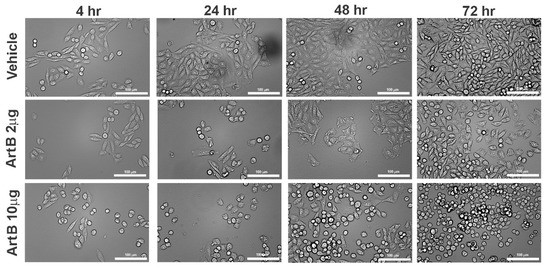 Cellular aggregate and morphology of CHO cells incubated with the ArtB subunit. CHO cells incubated with ArtB (2 μg and 10 μg) at 4, 24, 48 and 72 h. All images collected using brightfield microscopy (20×, scale bar = 100 μm).