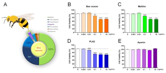Cell viability assays of bee venom and its components such as melittin, PLA2, and apamin using the cell counting kit (CCK) assay after 24 h from treatment in DIV6 mature cortical neurons. (A) Schematic presentation of bee venom composition. (B) CCK assay of neuronal cell viability after treatment with (B) bee venom, (C) melittin, (D) PLA2, and (E) apamin after 24 h of incubation with cortical neurons. Data are expressed as the mean ± standard error of the mean (SEM). Significant differences indicated as * p < 0.05 and *** p < 0.001 vs. the blank group, as analyzed by the one-way analysis of variance (ANOVA) and Tukey’s post-hoc test.