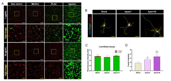 We performed a live/dead cell assay to additionally confirm cell viability through the quantification of live (green) and dead (red) cells under the same culture conditions. The cells were mostly observed as green-stained viable cells after apamin treatment at 1 and 10 µg/mL, whereas viable cells were mostly not detected in 1 and 10 µg/mL of bee venom, melittin, and PLA2 (Figure 2A). The fluorescence intensity of the apamin-treated cells stained with green or red dye was quantified and compared to that of the blank group. The green fluorescence intensity was not significantly different between the groups (Figure 2C). In addition, the live/dead assay visually showed that the cells were still viable for 48 h incubation with 1 and 10 µg/mL apamin (Supplementary Materials, Figure S1B). Thus, apamin did not exert any cytotoxic effect on neurons, as observed in the CCK assay. We also observed that apamin treatment resulted in longer neurite outgrowth at the single-cell level as well as a dose-dependent increase in the neurite length (Figure 2B). In particular, neurons treated with apamin contained a high concentration of F-actin in the filopodial tips of growth cones (Figure 2D). The results confirmed the safety and efficacy of apamin as a potential contributor to neurite outgrowth.