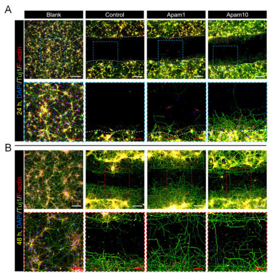 We performed immunocytochemistry to quantify the neurite outgrowth and axon regeneration in the cultured cortical neurons. The samples were analyzed after 24 or 48 h of the apamin treatment (1 or 10 µg/mL) in lacerated cortical neurons. In brief, the samples were fixed with 4% paraformaldehyde for 30 min, rinsed three times with PBS for 5 min per rinse, and then incubated with 0.2% triton X-100 in PBS for 5 min. After two rinses with PBS for 5 min and blocking with 2% normal goat serum in PBS for 1 h, the samples were incubated with primary antibodies diluted in 2% normal goat serum overnight at 4 °C. The primary antibodies used were as follows: brain-derived neurotrophic factor (BDNF; 1:200; Abcam, Cambridge, MA, USA), nerve growth factor (NGF; 1:100; Abcam), Tuj1 (1:2000; R&D systems, Minneapolis, MN, USA), and rhodamine phalloidin (F-actin; 1:1000; Invitrogen). After three washes with PBS for 5 min per wash, the samples were incubated with fluorescent conjugated secondary antibodies (FITC-conjugated goat anti-rabbit IgG, FITC-conjugated goat anti-mouse IgG, Rhodamine Red-X-conjugated goat anti-rabbit IgG, Rhodamine Red-X-conjugated goat anti-mouse IgG, Jackson Immuno-Research Labs, West Grove, PA, USA) diluted at 1:300 in 2% normal goat serum for 2 h. After 2 h of incubation at room temperature, the cells were washed three times for 5 min with PBS. The samples were treated with 4-6-dia-midino-2-phenylindole (DAPI; Tokyo Chemical Industry Co., Tokyo, Japan) containing PBS for 10 min at room temperature. Subsequently, the cells were washed three times with PBS for 5 min, mounted with fluorescence mounting medium (Dako Cytomation, Carpinteria, CA, USA), and imaged using a confocal microscope (Eclipse C2 Plus, Nikon). To quantify neurite outgrowth, we first captured the 10 representative images at 400× magnification using confocal microscopy with fixed acquisition settings and then we used three parameters, the total, mean, and maximum neurite outgrowth, using ImageJ software (1.53 v, Fiji Distribution, National Institute of Health, Bethesda, MD, USA). In addition, the average intensity was compared quantitatively through ImageJ software using confocal images captured under the same acquisition settings.