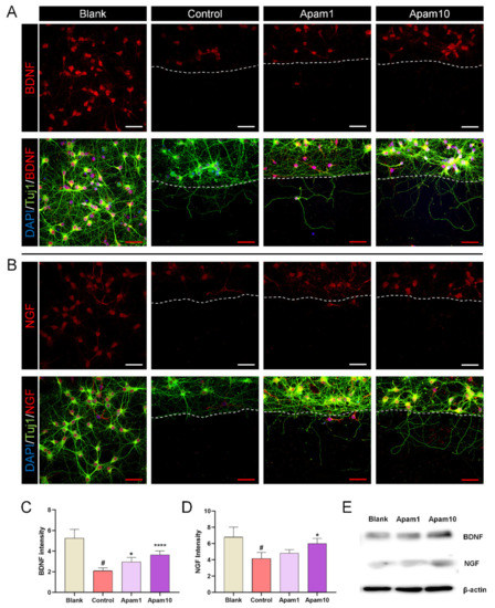 Effect of apamin on BDNF and NGF expression at 24 h after laceration injury in DIV6 mature cortical neurons. (A,B) Representative fluorescence images of expression of neurotrophic factors, stained for Tuj1 (green), BDNF (red), and DAPI (blue), or Tuj1 (green), NGF (red), and DAPI (blue), and laceration injury in DIV6 mature cortical neurons. White scale bar = 200 µm. Red scale bar = 50 µm. (C,D) Quantification intensities of (C) BDNF and (D) NGF in each group. (E) Western blot analysis of BDNF and NGF after 1 and 10 µg/mL of apamin treatment in mature cortical neurons. Data are expressed as the mean ± standard error of the mean (SEM). Significant differences indicated as # p < 0.001 compared with the blank group; * p < 0.05 and **** p < 0.0001 vs. the control group, as analyzed via one-way analysis of variance (ANOVA) with Tukey’s post-hoc test.