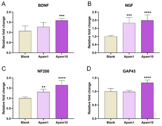 Real-time PCR analysis for (A) BDNF, (B) NGF, (C) NF200, and (D) GAP43 after 24 h of the apamin treatment in DIV6 mature cortical neurons. Data are expressed as the mean ± standard error of the mean (SEM). Significant differences indicated as ** p < 0.01, *** p < 0.001, and **** p < 0.0001 vs. the blank group, as analyzed via one-way analysis of variance (ANOVA) with Tukey’s post-hoc test.