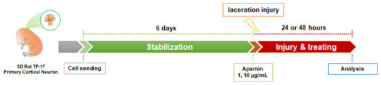 Laceration injury has been previously described in detail [23]. Cortical neurons were cultured in a neuronal culture medium on poly-D-lysine- and laminin-coated 12 mm coverslips inside 24-well culture plates until DIV6. Neurites were then mechanically wound by dragging a 10 µL pipette tip centrally across the coverslip, followed by treatment with apamin at 1 and 10 µg/mL, and fixation of the cells after 24 or 48 h. The experimental design showing the timeline of the procedures is described in Figure 6.