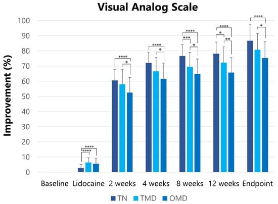 Changes in improvements in visual analog scale scores. Changes in the degree of improvement of visual analog scale scores were observed after lidocaine injection and at two, four, eight, and 12 weeks after BoNT/A injections. TN: trigeminal neuralgia, TMD: temporomandibular disorder, OMD: oromandibular dystonia. * p < 0.05, ** p < 0.01, *** p < 0.005, **** p < 0.001.