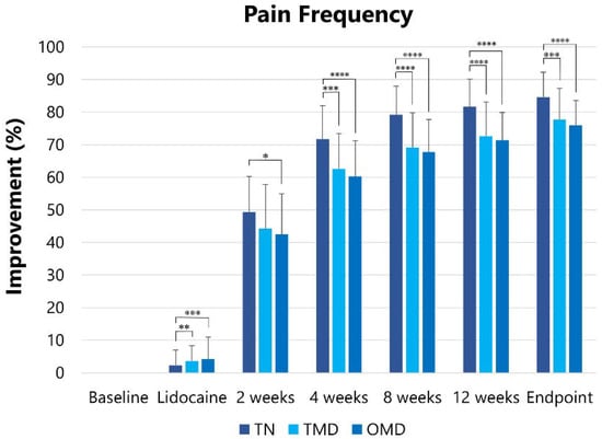 Changes in improvement in pain frequency. Changes in the degree of improvement in pain frequency were observed after the lidocaine injection and at two, four, eight, and 12 weeks after BoNT/A injections. TN: trigeminal neuralgia, TMD: temporomandibular disorders, OMD: oromandibular dystonia. * p < 0.05, ** p < 0.01, *** p < 0.005, **** p < 0.001.