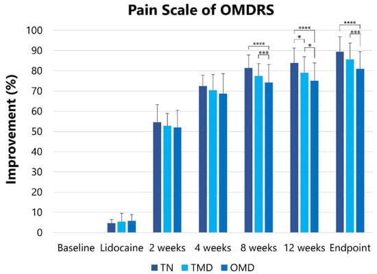 The pain scale at baseline was reduced (p < 0.001) after the lidocaine injection, two, four, eight, and 12 weeks after the first botulinum toxin therapy, and at the endpoint (Table 4). The pain scale of the OMDRS [] at baseline was significantly (p < 0.001) higher in TN (28.6 ± 3.6) than in TMD (21.6 ± 7.5) and OMD (20.3 ± 7.4). After the Greenhouse–Geisser correction, the effects were significantly different among the groups (F = 18.777, p < 0.001). Significant differences are shown in Figure 3.