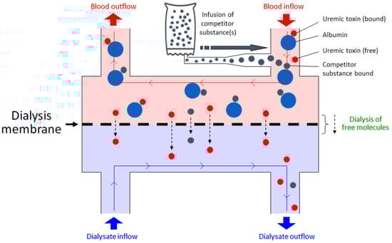 Schematic of binding competition between the protein-bound uremic toxin and competitor substance for the same binding site. The competitor drug is infused pre-dialyzer, leading to an increase in free toxin concentration and thus improved dialytic removal.