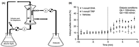 (A) In vitro dialysis setup where albumin solution spiked with indoxyl sulfate was dialyzed against standard dialysate solution. Two binding competitors (denoted as “displacers”) were tested individually. (B) Indoxyl sulfate removal (measured at the dialysate outlet) for 10 min before and 10 min after starting the infusion upstream of the dialyzer (start of infusion denoted by the vertical dashed line). Three types of infusions were tested: phosphate-buffered saline (PBS) only (“Vehicle”), PBS with 1 mmol/L tryptophan (“TRP”), and PBS with 1 mmol/L docosahexaenoic acid (“DHA”).