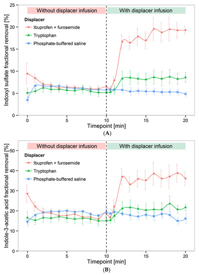 In 2016, Tao et al. further validated the binding competition approach ex vivo, where human whole blood spiked with IS, indole-3-acetic acid (IAA), and hippuric acid (HA) was dialyzed with either an ibuprofen + furosemide infusion or with a TRP infusion only, and toxin removal in the dialysate outlet stream was compared against phosphate-buffered saline infusion without binding competitors [17]. The ibuprofen and furosemide cocktail increased the IS fractional removal from 6.4% to 18.3%, and IAA fractional removal from 16.8% to 34.5%. TRP infusion increased the fractional removal of IS and IAA to 10.5% and 27.1%, respectively. Moderate effects were observed for HA in all infusion scenarios (Figure 3). This study confirmed important aspects about the binding affinity of toxins as well as that of binding competitors. For PBUTs with weak binding affinity to albumin, binding competitors provided only moderate gains in terms of toxin removal. Conversely, competitors with stronger binding affinity provided greater improvement in PBUT removal; here, the ibuprofen binding affinity (2.7 × 106 M−1) was much higher than the TRP binding affinity [16]. Tao et al. did not use DHA in this ex vivo setup because it caused hemolysis (data not shown).