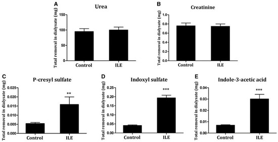Total removal of (A) urea, (B) creatinine, (C) p-cresyl sulfate, (D) indoxyl sulfate, and (E) indole-3-acetic acid in 3 h dialysis in pre-clinical 5/6 nephrectomized rat model. Removal was studied in the control arm vs. intralipid emulsion infusion (binding competitor) arm (figure obtained with permission from NDT). *** p < 0.001 and ** p < 0.01 compared with the control group.