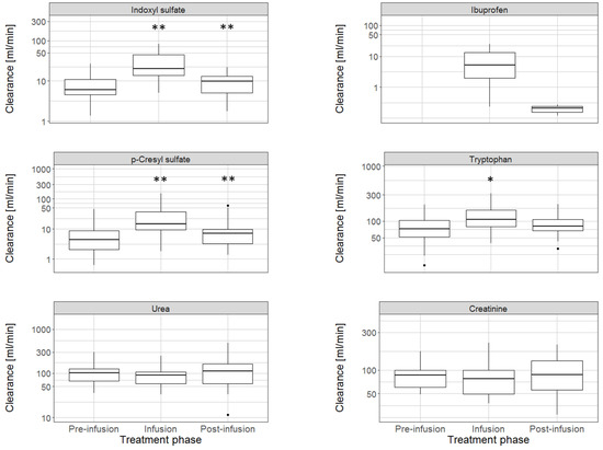 Dialytic clearance of uremic solutes during conventional hemodialysis before, during, and after infusion of a binding competitor into the arterial line upstream of the dialyzer. Ibuprofen was used as the binding competitor. Compared to the pre-infusion phase, there was a significant increase in indoxyl sulfate and p-cresyl sulfate clearance during the ibuprofen infusion, while the clearance of urea and creatinine (non-protein bound solutes) did not change. [* p-value, 0.01 compared with preceding phase; ** p-value, 0.001 compared with preceding phase; based on Wilcoxon signed rank test].