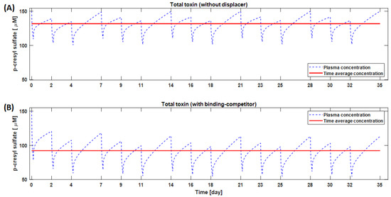Model simulations suggest that strong binding affinity is not the only criterion for the choice of a good binding competitor. For example, a higher amount of TRP (2000 mg in 500 mL saline) can outperform ibuprofen (800 mg in 200 mL saline), even though tryptophan binding affinity to albumin is an order of magnitude lower than that of ibuprofen [16]. The ibuprofen dose was restricted to 800 mg in our simulations as per FDA guidelines for a single-dose administration. Prolonged (one-month) use of TRP reduces the IS and pCS time-averaged concentration by 28.1% and 29.9%, respectively, compared to conventional HD. In Figure 7, we highlight the long-term kinetics and time-averaged concentration of pCS with and without a binding competitor. Here, a typical HD subject 70 kg in weight was dialyzed 3 times a week × 4 h per session, and the binding competitor was infused upstream of a dialyzer at a constant rate during dialysis [22].