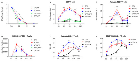 Recall infections lead to expansion of CD69+CD103+ T cell subsets in the lung of first PTX-exposed infected mice. Mice infected twice were intra-nasally inoculated with 6 × 106 CFU/20 µL of WT or ΔPTX strains 6 weeks after the primary infection. (A) Numbers of CFU following a second infection from D2 to D9 p.i in WT/WT, WT/ΔPTX, ΔPTX/ΔPTX and ΔPTX/WT groups. Frequency of (B) activated CD4+ T cells and (C) CD69+CD103+ T cells, recorded from D2 to D27 p.i. in secondary infected mice. (D) Absolute numbers of CD69+CD103+ CD4+ T cells. (E) Frequency of lung IL-17A-producing CD4+activated T cells, and (F) CD69+CD103+ CD4+T cells harvested from D2 to D27 p.i. following WT, WT/WT, WT/ΔPTX or PBS (CTRL) inoculation. Results are mean ± SD for at least 4 to 5 mice/group and are representative of three independent experiments. Statistical significance of differences are shown. For Figure 2B–E * p-value < 0.05 WT/WT vs. CTRL, ΔPTX/ΔPTX and ΔPTX/WT; ** p-value < 0.01 WT/WT vs. CTRL, ΔPTX/ΔPTX and ΔPTX/WT, *** p-value < 0.001 WT/WT vs. CTRL, ΔPTX/ΔPTX and ΔPTX/WT, **** p-value < 0.0001 WT/WT vs. CTRL, ΔPTX/ΔPTX and ΔPTX/WT; ## p-value < 0.01 WT/ΔPTX vs. CTRL, ΔPTX/ΔPTX and ΔPTX/WT, ### p-value < 0.01 vs. CTRL, ΔPTX/ΔPTX and ΔPTX/WT, #### p-value < 0.0001 vs. CTRL, ΔPTX/ΔPTX and ΔPTX/WT. For Figure F: * p-value < 0.05 WT/WT vs. CTRL; ** p-value < 0.01 WT/WT vs. CTRL, *** p-value < 0.001 WT/WT vs. CTRL, **** p-value < 0.0001 WT/WT vs. CTRL; ## p-value < 0.01 WT/ΔPTX vs. CTRL, ### p-value < 0.01 vs. CTRL, amd #### p-value < 0.0001 vs. CTRL.
