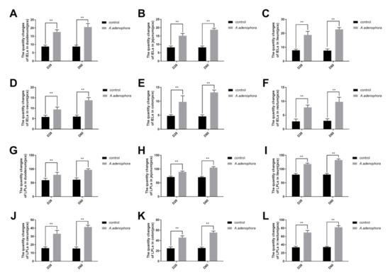 The intestinal intraepithelial lymphocytes (IELs) and lamina propria leukocytes (LPLs) counts in rats from the control and A. adenophora groups after 60 days of experimental feeding. (A–F) Intestinal intraepithelial lymphocytes (IELs) in intestines of rats. (G–L) Lamina propria leukocytes (LPLs) counts in various intestinal sections of rats. Bars represent means ± SD for eight rats per treatment. Within the same day (D), bars with ** differ significantly (p < 0.01). Control = rats were fed only basal diet. A. adenophora = rats were fed a mixture of basal diet and leaf powder of A. adenophora in a 7:3 ratio.