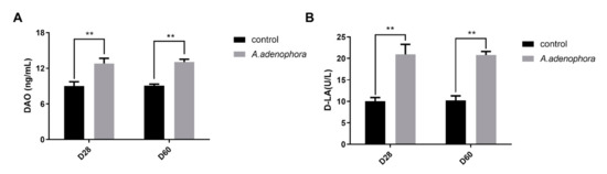 DAO and D-LA concentrations in rats’ serum from the control and A. adenophora groups after 60 days experimental feeding. (A) DAO levels in serum of rats. (B) D-LA levels in serum of mice. Bars represent means ± SD for 8 rats per treatment. Within the same day (D), bars with ** differ significantly (p < 0.01). Control = rats were fed only basal diet. A. adenophora = rats were fed a mixture of basal diet and leaf powder of A. adenophora at 7:3 ratio.