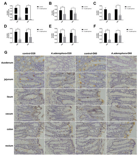 Occludin levels in the various section of rat intestine from the control and A. adenophora groups after 60 days of experimental feeding. (A–F) Occludin levels in various intestinal sections of rats. Bars represent means ± SD for eight rats per treatment. Within the same day (D), bars with ** or * differ significantly (p < 0.01 or p < 0.05). (G) Immunohistochemistry staining photographs of intestinal sections (yellow area represents occludin). Control = rats were fed only basal diet. A. adenophora = rats were fed a mixture of basal diet and leaf powder of A. adenophora in a 7:3 ratio.