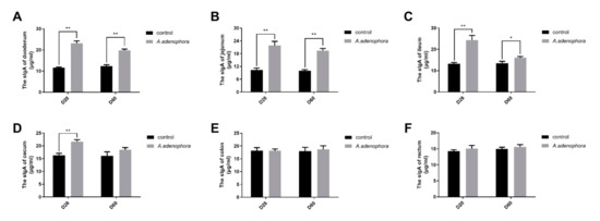 Intestinal mucosa sIgA levels in rats from the control and A. adenophora groups after 60 days of experimental feeding. (A–F) sIgA levels in various intestinal sections of rats. Bars represent means ± SD for eight rats per treatment. Within the same day (D), bars with ** or * differ significantly (p < 0.01 or p < 0.05). Control = rats were fed only basal diet. A. adenophora = rats were fed a mixture of basal diet and leaf powder of A. adenophora in a 7:3 ratio.
