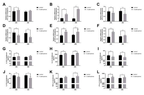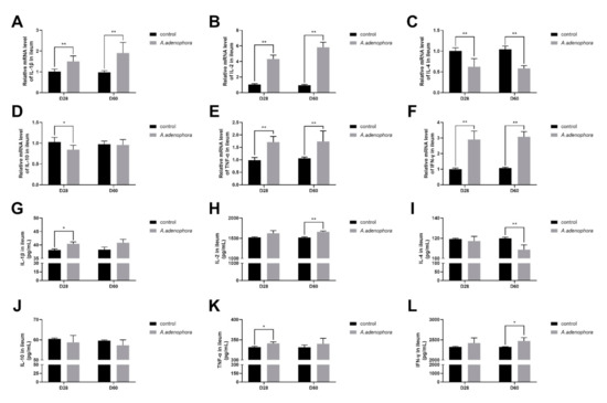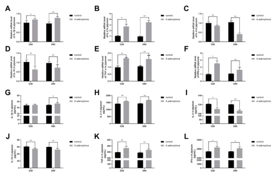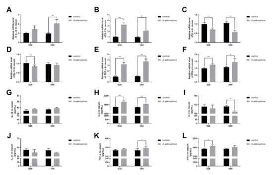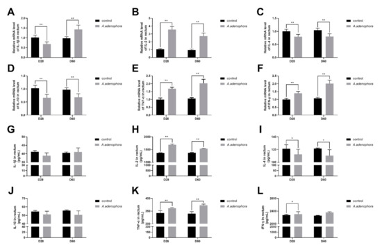 From the gene expression results, it was observed that the levels of pro-inflammatory cytokines (IL-1β, IL-2, TNF-α, and IFN-ϒ) were all increased in the A. adenophora treatment groups as compared to the control at all the timepoints, except that the gene expression levels of IL-1β showed no significant increase at D60 (p > 0.01 or p > 0.05). In addition, we also observed that the gene expression levels of anti-inflammatory cytokines (IL-4 and IL-10) in the treatment group were significantly reduced compared to the control at all the timepoints (p < 0.01, Figure 6A–F).